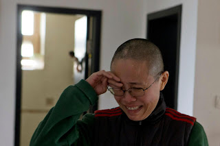 长期关注中国人权的活动人士胡佳10月9号对美国之音记者表示,刘霞在刘晓波获奖后被软禁两年,无法与外界联系,备受煎熬,近期才获准每月赴千里 之外的锦州监狱探视丈夫一次,需要社会关注和声援。9月18号开始又被软禁在家的胡佳透露,他过去几个月里曾数次到刘霞住处试图闯关探望,但都被 那里的国保阻拦,唯有一次,他趁夜间在楼下看到窗边的仍然是光头的刘霞在抽烟,他用手势跟刘霞打招呼,两人在无声中对望,一共大约20分钟。